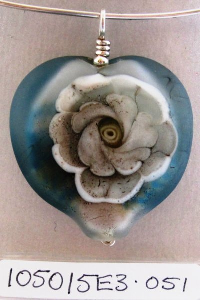 Boro bead pendant.Inner layer is a dark teal, with swirls of colour. The outer layer is a green and brown vine . S/S wire. 40mm x 30mm