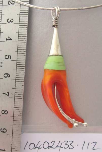 Orange Fushia Flower, soft glass. Yellow on the inside with a fine black stripe on the petals. Sterling silver findings and stamen (full length not shown). Chain ready. 70 x 20mm. $90