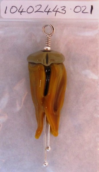 Kowhai flower of New Zealand, soft glass. Sterling silver findings and stamen. Chain ready. Etched lightly for a softer non glossy effect. 60 x 25mm.