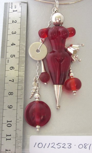 Transparent Red Goddess collection. Soft glass, with Sterling/Silver accents (Owl and Rose). Ready to wear on a chain. 92 x 30mm