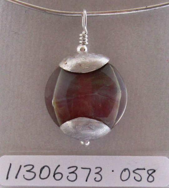 Dark aqua with raised purple dots boro hollow bead pendant. s/s cone etc. 48mm x 30mm. $75