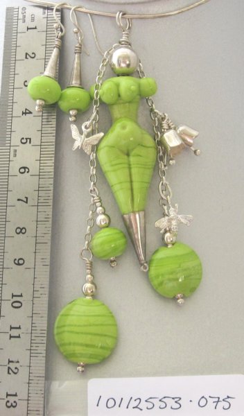 Transparent Teal Sea Goddess collection with matching earrings. Soft glass, with Sterling/Silver accents (Shell, Starfish and bells). Ready to wear on a chain. 90 x 27mm