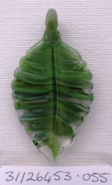 Olive Green Leaf pendant. boro. 65mm x 30mm. $35