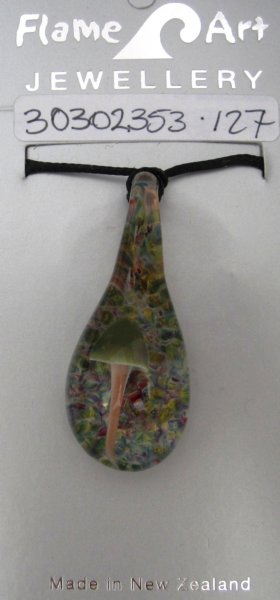 Sparkly teal capped Mushroom Pendant on cord. 45mm x 20mm. $30