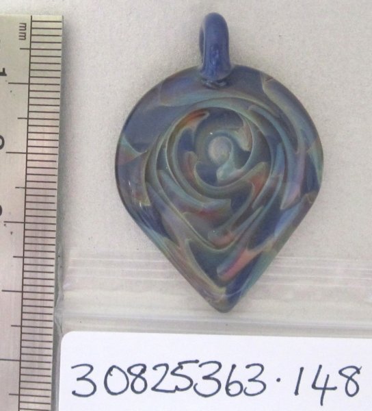 Ivory, Teal and Green Wigwag Pendant. Boro. 40mm x 30. $50