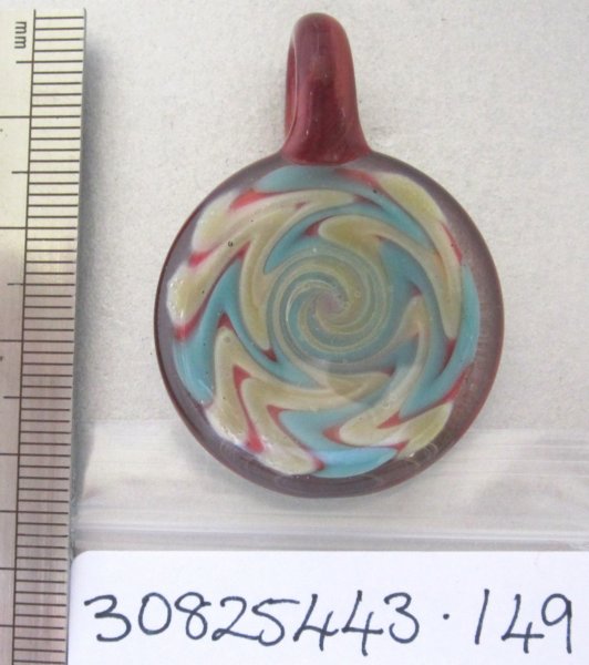Blue and Amber Tapered Wigwag Pendant. boro. 43mm x 30mm. $50